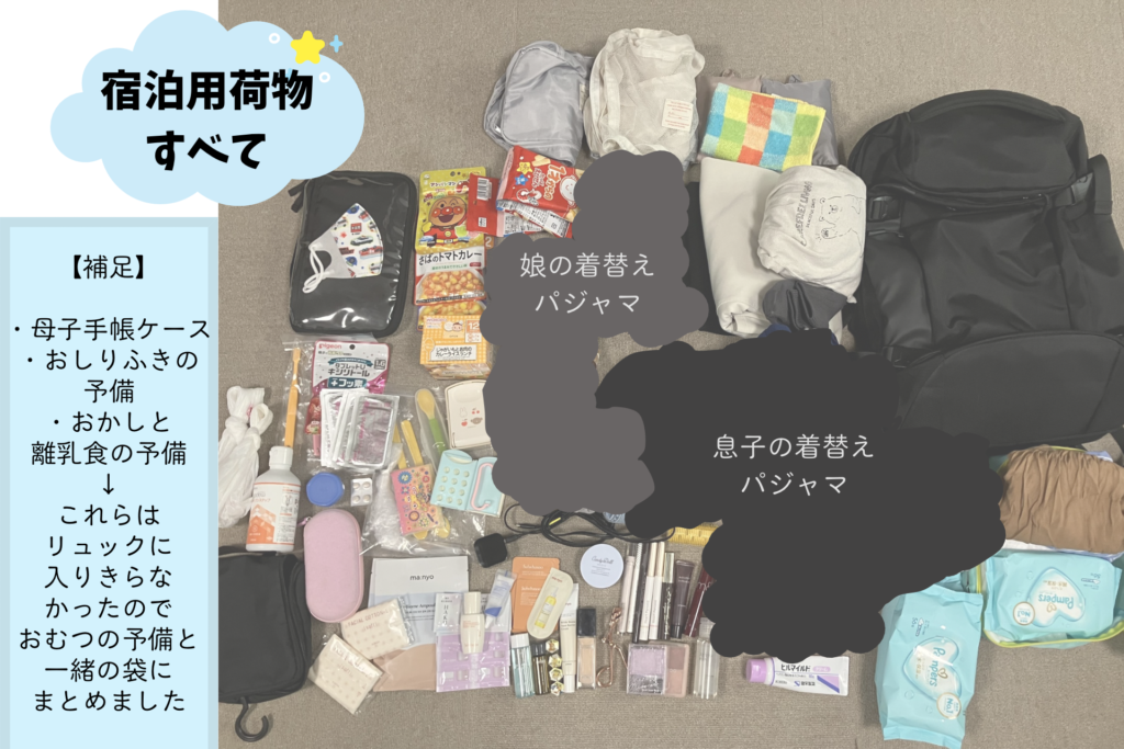 その代わり、スキンケアは現品を持っていかない、子どもたちの服も次の日に着る服+予備だけとできるだけ少なくしています。