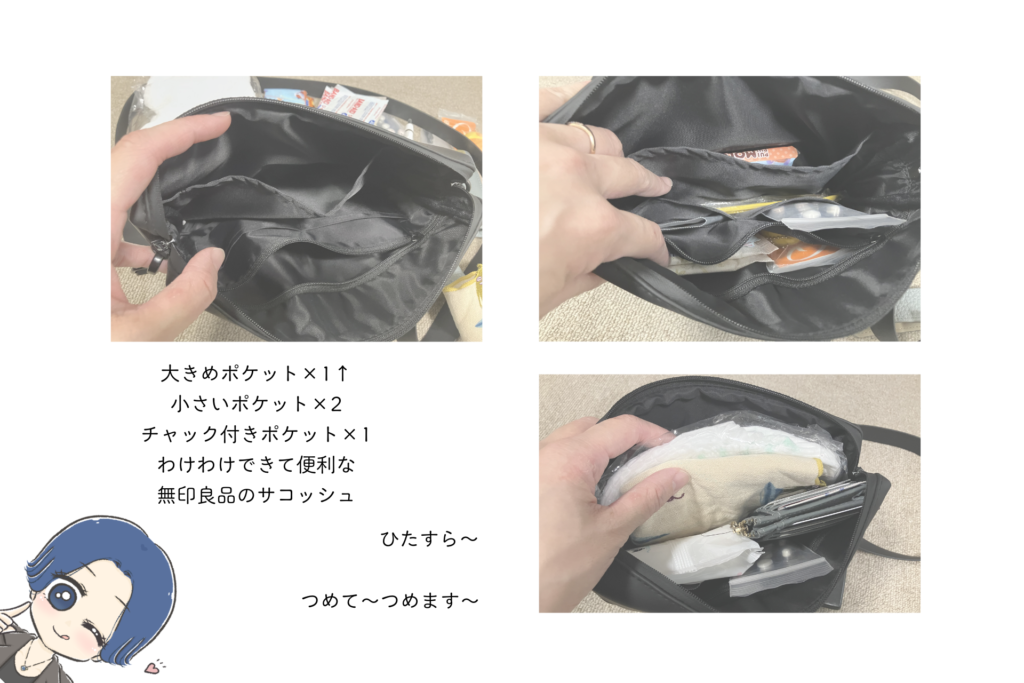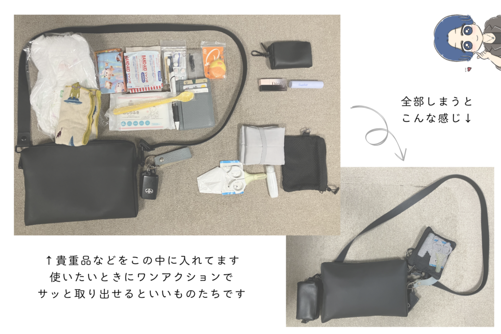 頻繁に使うものやサッと取り出して使いたいものは、サコッシュに入れて持ち歩いています。