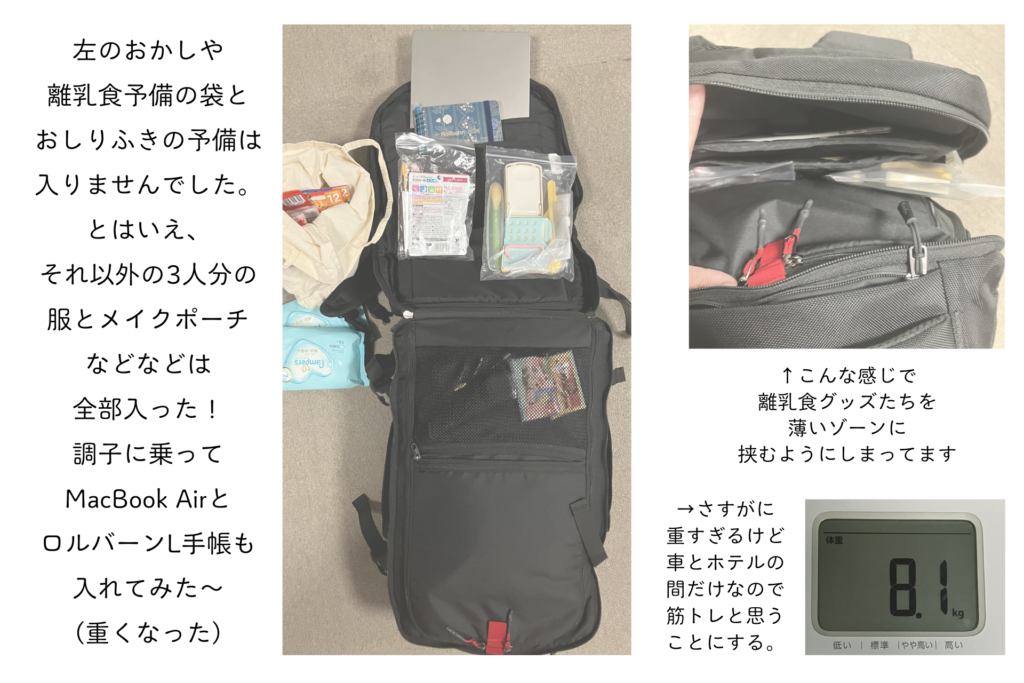 以外と余裕があったので、調子に乗ってMacBook Airや手帳も入れました。(これでトミカ博のレポ記事が書けるゾ)
