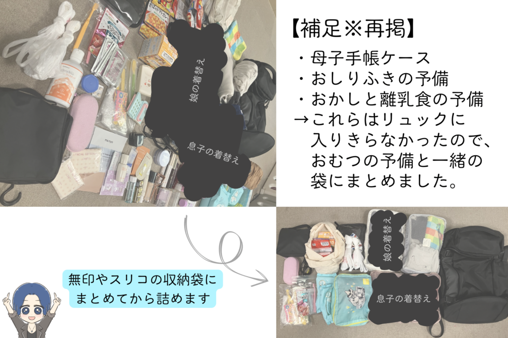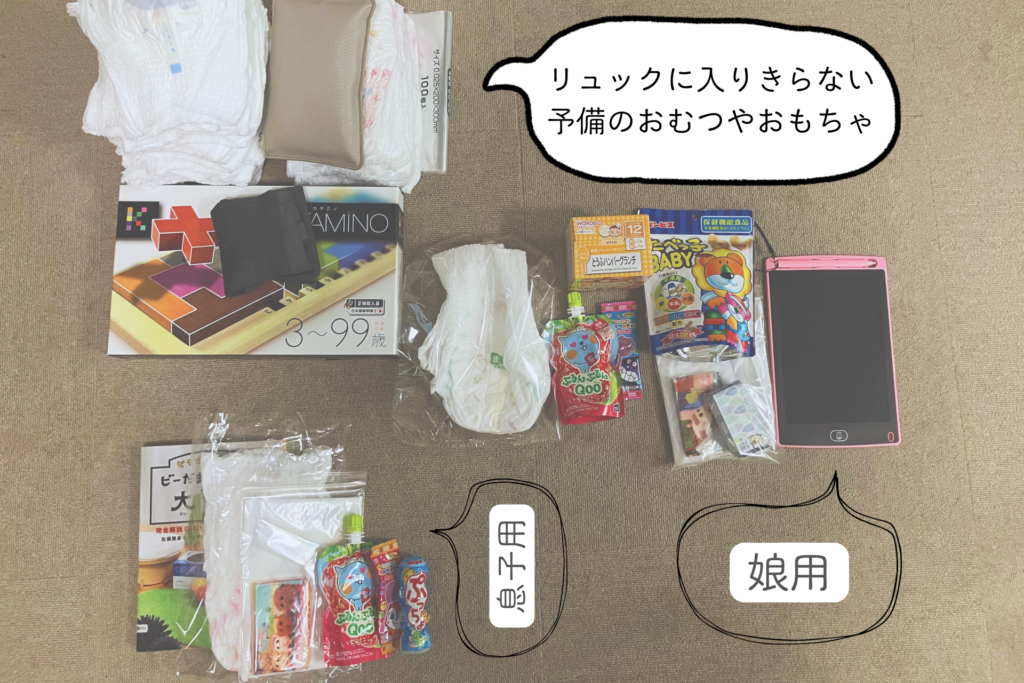 →娘のおむつ15枚、息子のおむつ3枚、ゴミ袋、私の生理用品予備、おもちゃ、リュックに入りきらなかった母子手帳・おしりふきの予備・離乳食の予備